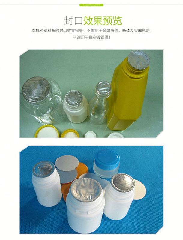 เครื่องปิดผนึกแบบเหนี่ยวนำแม่เหล็กแบบพกพาใช้หลักการเหนี่ยวนำแม่เหล็กไฟฟ้าเพื่อสร้างความร้อนสูงในทันทีเพื่อหลอมฟอยล์อลูมิเนียมให้ติดกับรูจุก, เพื่อให้บรรลุเป้าหมายในการป้องกันความชื้น ป้องกันการรั่วไหล ป้องกันเชื้อรา และยืดอายุการเก็บรักษา เหมาะสำหรับธุรกิจขนาดเล็กและการใช้งานในห้องปฏิบัติการ วัสดุขวดสามารถเป็นขวดแก้วและขวดพลาสติก เช่น PP, HDPE, PET เป็นต้น